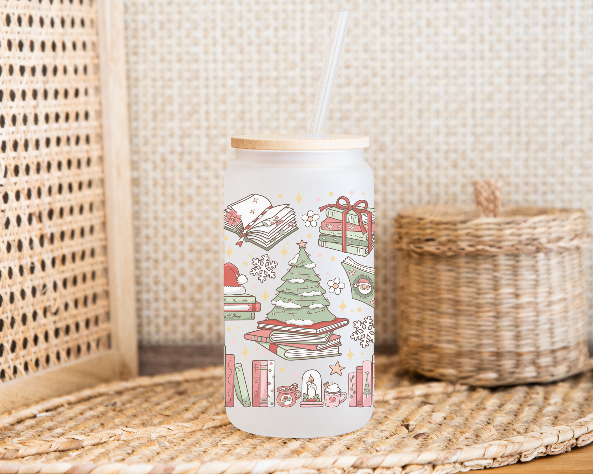 Celebrate the season with stacked books, twinkly trees, and steaming cocoa! This festive glass can is perfect for book lovers who want to sip in holiday style.