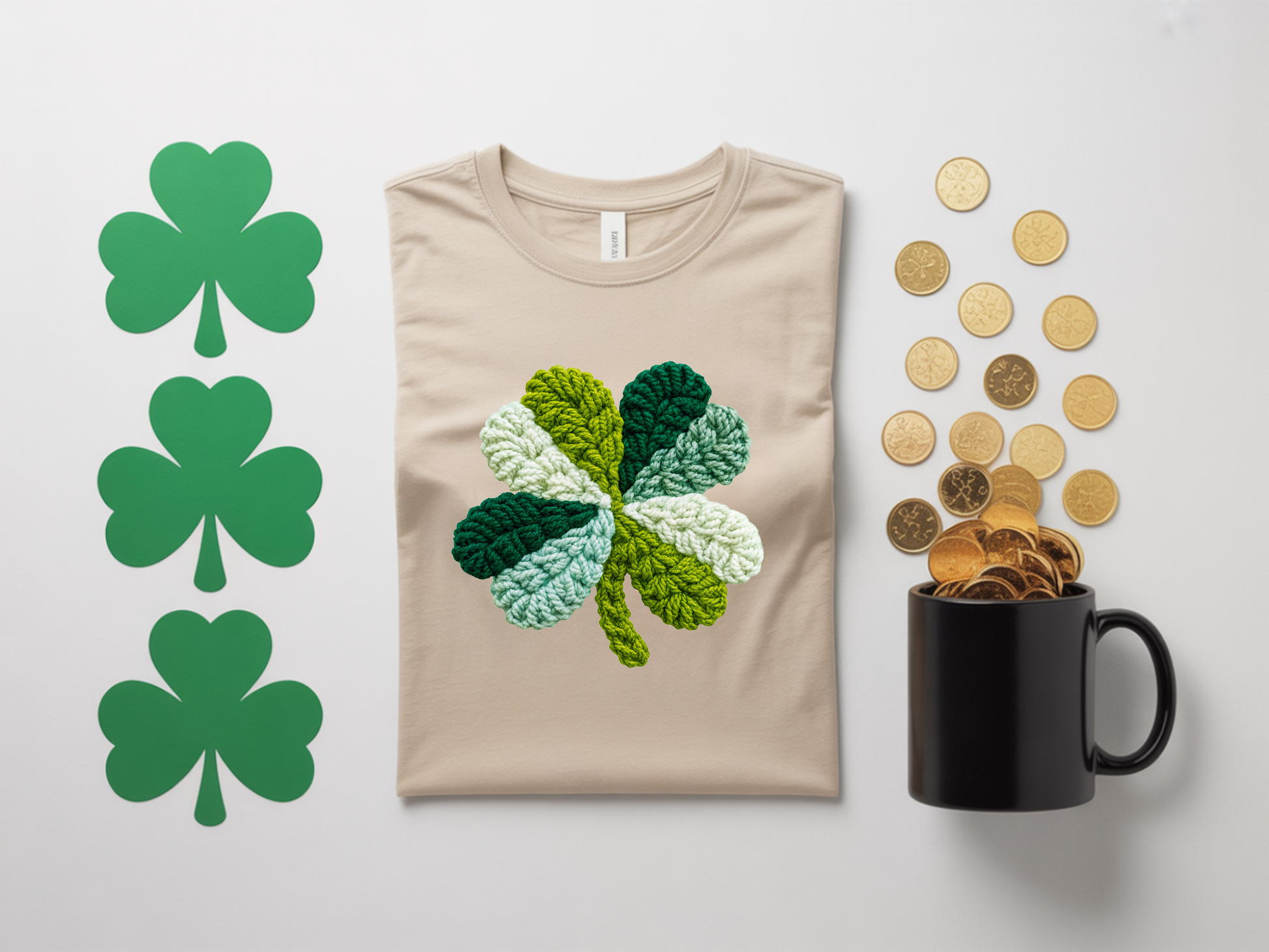 Cozy texture meets lucky charm with this crochet-inspired shamrock graphic. The stitched-look detail gives it that handcrafted, boutique feel, perfect for anyone who love a softer take on seasonal style that still makes a statement.