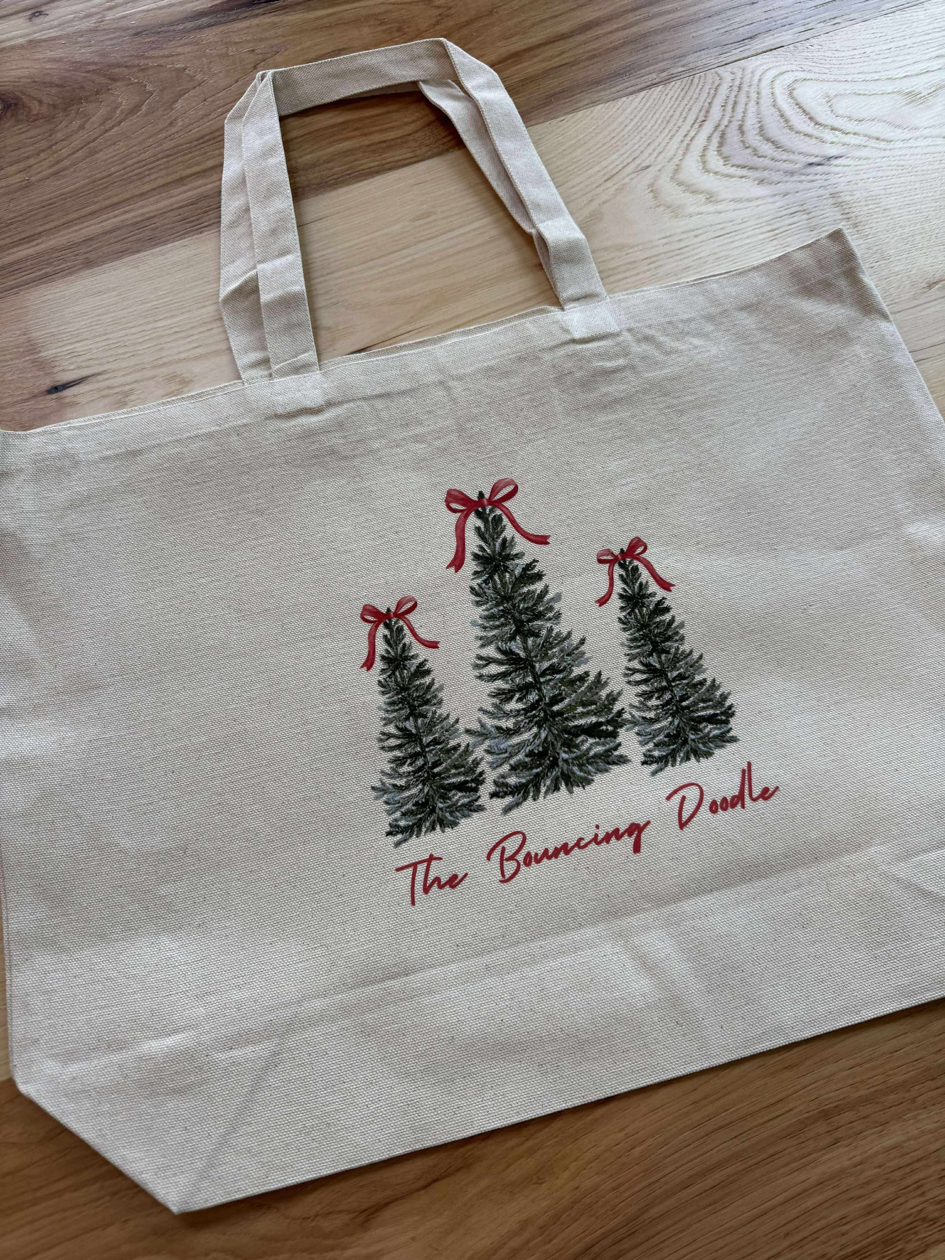 Meet your new go-to market tote! This oversized canvas bag features a trio of classic Christmas trees topped with festive red bows — and your boutique name printed beautifully beneath. Sturdy, roomy, and perfect for holiday errands or gift packaging.