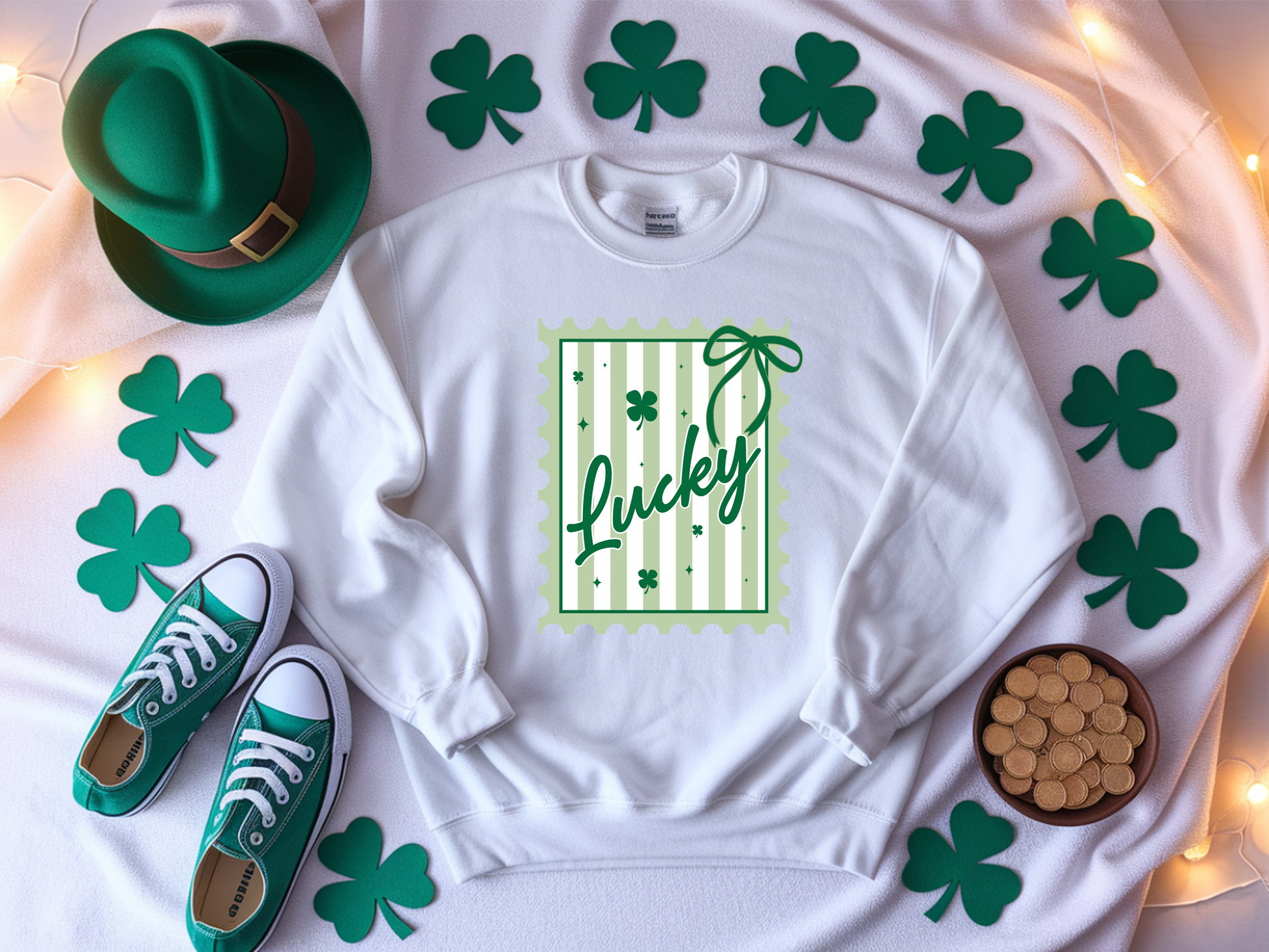 Clean, graphic, and effortlessly cute, this stamp-style design brings a fresh take on seasonal luck. With simple lines and charming details, it’s an easy add to any casual lineup.